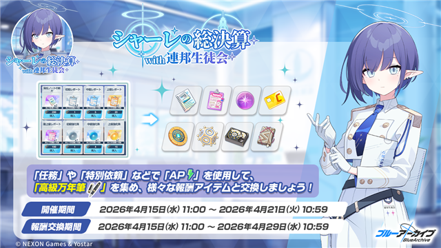 4月15日11:00より、不定期開催型コンテンツ「シャーレの総決算 with 連邦生徒会」を開催する。「任務」や「特別依頼」などの常設コンテンツにて「AP」を消費すると、アイテム「高級万年筆」を獲得でき、専用ショップで様々な育成素材と交換することが可能。