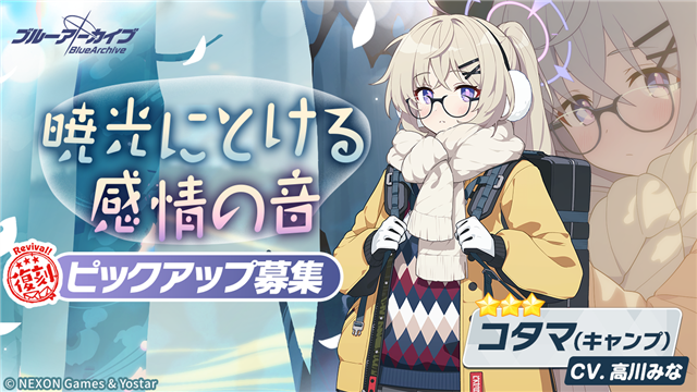 4月15日11:00より、復刻ピックアップ募集「天体より注ぐ情報の光」、復刻ピックアップ募集「暁光にとける感情の音」、復刻ピックアップ募集「晴天彩る情熱の色」、復刻ピックアップ募集「逃げ水を夢に見て」を開催する。冬キャンプ衣装に着替えた、ハッカー集団「ヴェリタス」のメンバー「ハレ(キャンプ)」、「コタマ(キャンプ)」、「マキ(キャンプ)」と、アリウススクワッドのメンバー「ミサキ」のピックアップ募集になる。