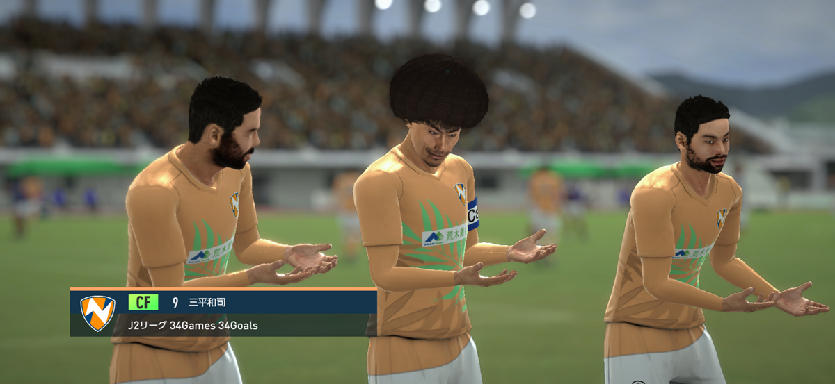 前半33分、ボンバーナッツ三平和司が得意の“狙いすましたシュート”で同点ゴール! この得点で三平は今季34試合出場34ゴールという驚異的な記録を打ち立てた。