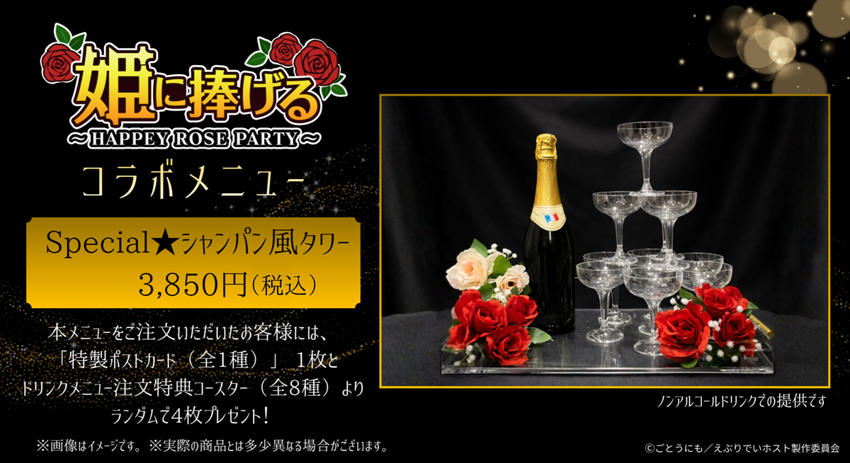 キャラクターをモチーフにした限定メニューやオリジナルグッズに加え、シャンパン風タワー体験など、作品の世界観を体感できる特別なひとときを提供する。
