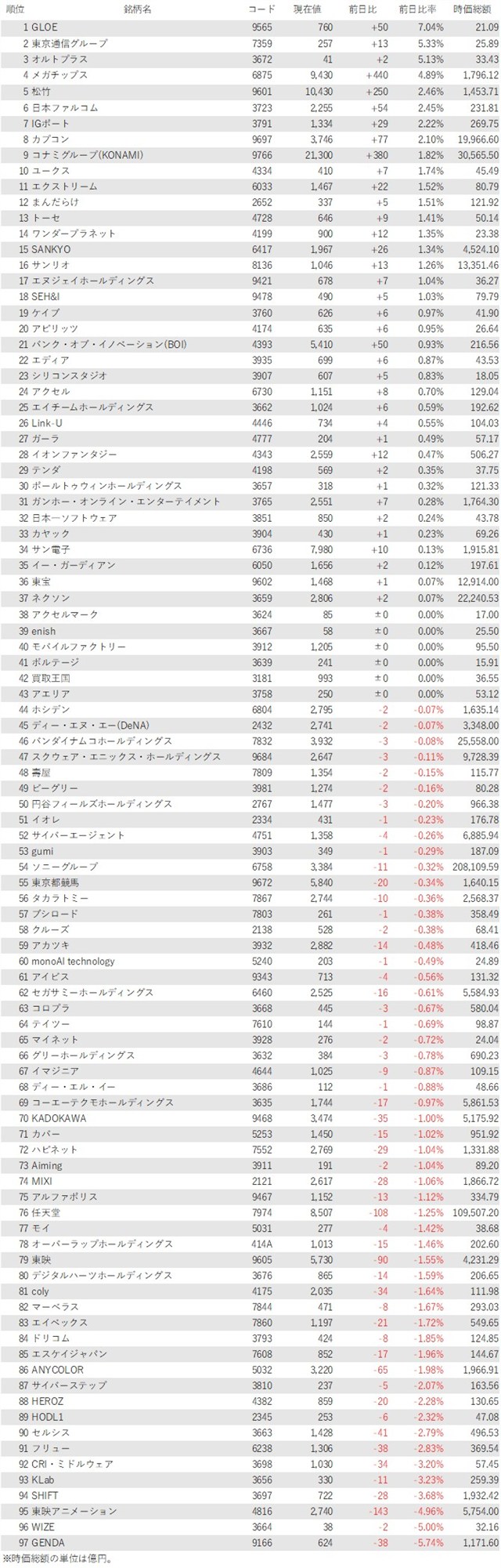 半面、任天堂<7974>が反落し、東映アニメ<4816>やKLab<3656>、フリュー<6238>なども安い。