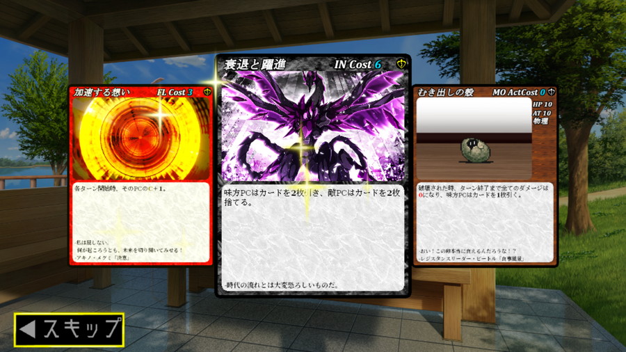 本作は、カード同士の組み合わせと手札や盤面の使い方が勝敗を分け、カード効果の連鎖によるテンポの良い展開も特徴とするカードバトルアドベンチャーゲームだ。
