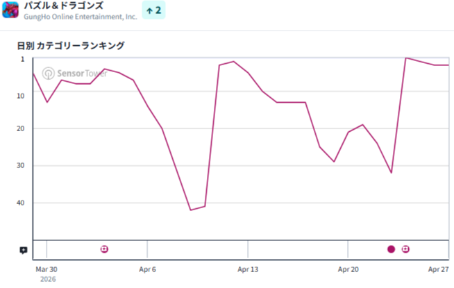 ガンホーの『パズル&ドラゴンズ』も3位に順位を上げた。金曜日には首位を獲得した。アニメ『銀魂』とのコラボを4月24日より実施している。今回のコラボでは、「志村新八&8連ガチャドラ衣装」や「神楽&ミヤ衣装」など人気モンスターの衣装をまとったキャラクターが新たに登場している。