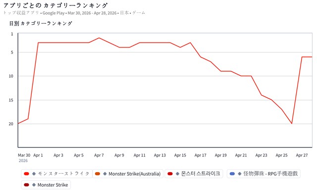続く6位には、MIXI<2121>の『モンスターストライク』が前日の20位から急浮上してきた。『モンスト』は、4月26日12時より、アニメ「けいおん!」とのコラボイベントを開催しており、コラボキャラクター4体と「エル」「リンネ」などを含む、超・獣神祭の限定キャラクター8体が排出対象となったガチャ「超・獣神祭×けいおん!」を実施していることなどが売上に大きく貢献しているもようだ。