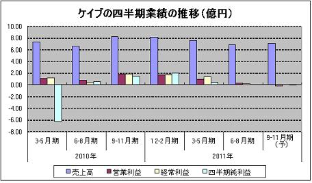 ケイブの四半期業績の推移は、下のグラフに示したとおりだが、2011年5月期の第3四半期(2010年12-2011年2月期)以降、「しろつく」に続くヒットが出ず売り上げが伸び悩む一方、開発費や広告宣伝費などが増加し利益面も低迷を余儀なくされてきた。