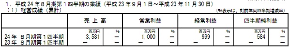 なお、第1四半期の実績から計算した第2四半期会計期間(2011年12月-2012年2月期)の業績予想は、売上高39億円(前四半期比8.9%増)、営業利益10億円(同変わらず)、経常利益10億円(同0.1%増)、四半期純利益5億8900万円(同0.9%増)となり、前四半期比では利益はほぼ横ばいとなる見通し。