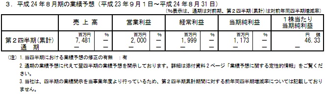 続く第2四半期累計(2011年9月-2012年2月期)の業績予想は、売上高74億8100万円、営業利益20億円、経常利益19億9900万円、四半期純利益11億7300万円を見込む。