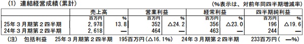 なお、同時に第2四半期累計(4-9月期)の連結決算についても、売上高29億7800万円(前年同期比13.8%増)、営業利益3億5200万円(同24.2%減)、経常利益3億5600万円(同23.0%減)、四半期純利益1億9600万円(同19.6%減)だった。