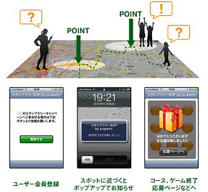 「スタンプラリーASP by popinfo」は、Android/iPhone/NTTドコモのiコンシェルに対応したサービス。