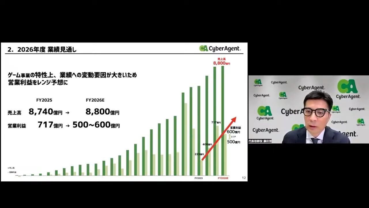 サイバーエージェント、26年9月期の業績見通しをレンジ予想にしたのはゲーム事業の特性を考慮 「足元は好調だが1年先の予測は困難」(藤田社長)