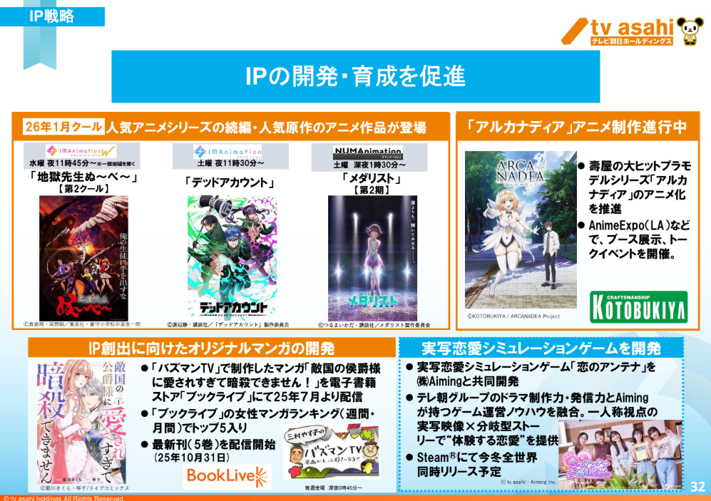 テレ朝HD、人気原作・シリーズ続編のアニメを26年1月から続々放送…「アルカナディア」制作進行中、実写恋愛SLG「恋のアンテナ」の開発も