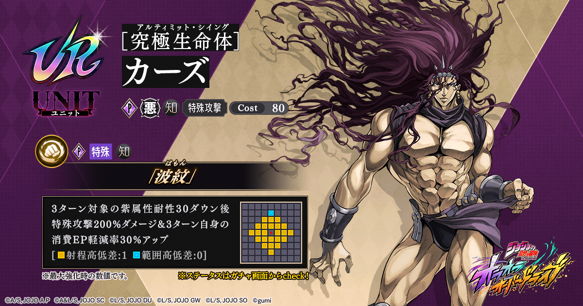 gumi、『ジョジョの奇妙な冒険 オラオラオーバードライブ』で新ユニット【究極生命体】カーズが明日登場