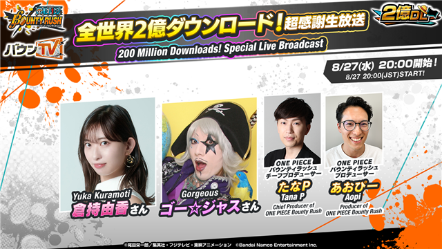 バンダイナムコENT、『ONE PIECE バウンティラッシュ』が8月27日に「全世界2億ダウンロード!超感謝生放送」を配信決定!