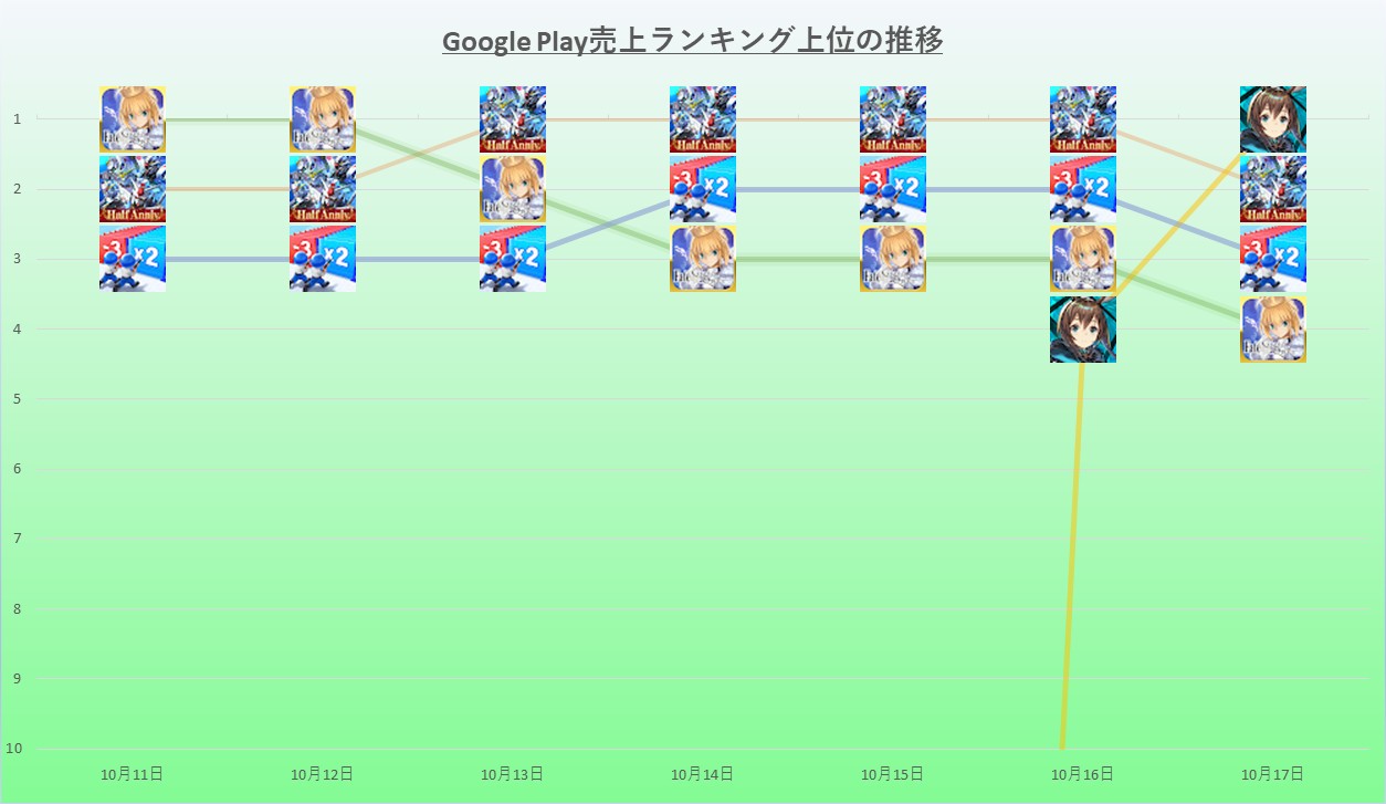 【GooglePlay(10/11~10/17)】『ジージェネエターナル』が『FGO』から首位を奪いそのまま1週間を終えるかに見えたが『アークナイツ』が急襲