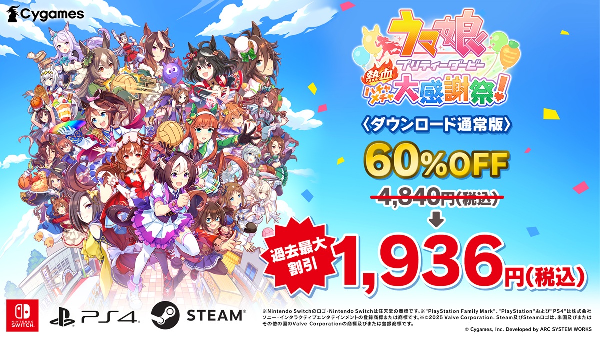 Cygames、 『ウマ娘 プリティーダービー 熱血ハチャメチャ大感謝祭!』発売1周年記念イラストを公開&70%OFFセール実施中!