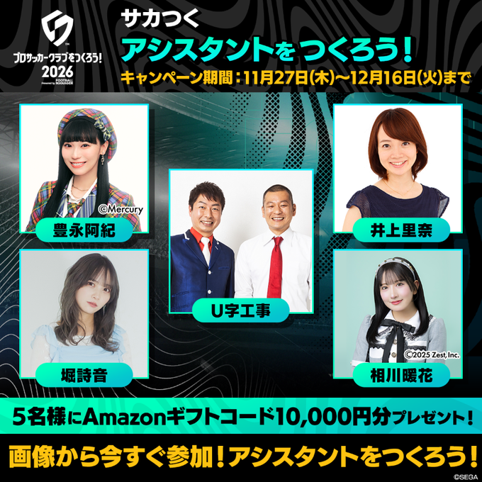 セガ、『サカつく2026』にて「アシスタントをつくろう!」を開催中…候補者は相川暖花さん、井上里奈さん、豊永阿紀さん、堀詩音さん、U字工事さん