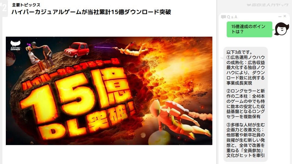 カヤックの決算説明資料より…ハイカジ全46タイトルの累計DL数が全世界で15億DLを達成 3Q期間(7~9月)は3本の新作をリリースして年間目標の8本に到達