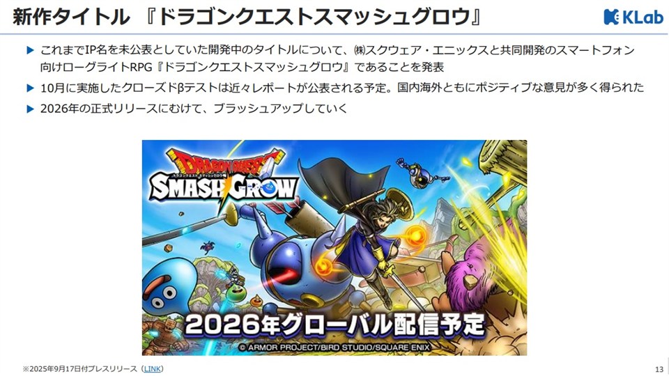 KLabの決算説明資料より…『ドラゴンクエストスマッシュグロウ』の開発担当を発表 10月実施のCBTは国内海外ともにポジティブな反応と
