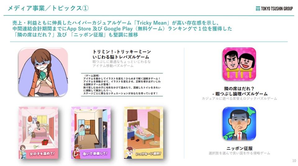 東京通信グループの決算説明資料より…ハイカジ『隣の席はだれ?』とカジュアルゲームアプリ『ニッポン征服』に続きハイカジ『Tricky Mean』がヒットに