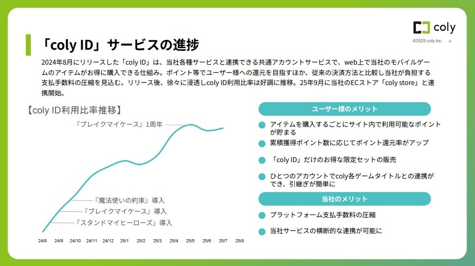 colyの決算説明資料より…アプリ外課金サービス「coly ID」の浸透で⽀払⼿数料を圧縮 ECストア「coly store」との連携でユーザーの利便性もさらに向上へ
