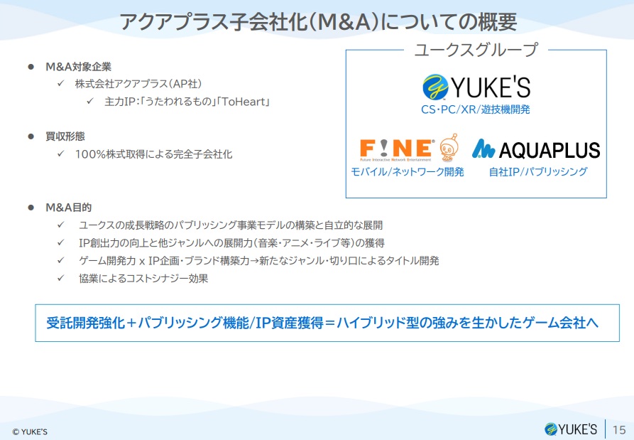 ユークスの決算説明資料より…アクアプラスの子会社化の理由は「強固なIPホルダー兼パブリッシャーであること」と「両社の強みが補完関係にあること」