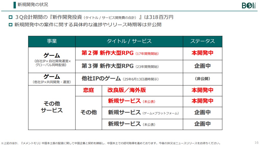 BOIの決算説明資料より…新規開発は新たに他社IPのゲームが追加 リリース時期は数年後の見込み 期中の新作開発投資は3億1800万円に