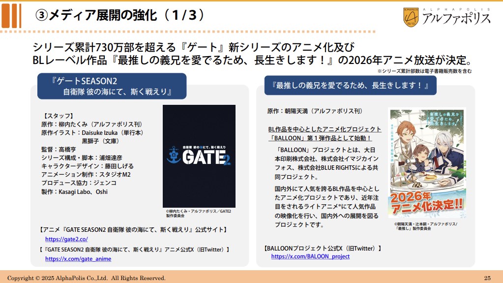 アルファポリスの決算説明資料より…「ゲート」新シリーズなど新たに2作品のアニメ化が決定 アニメ制作会社のWHITE FOXを7月31日付で買収