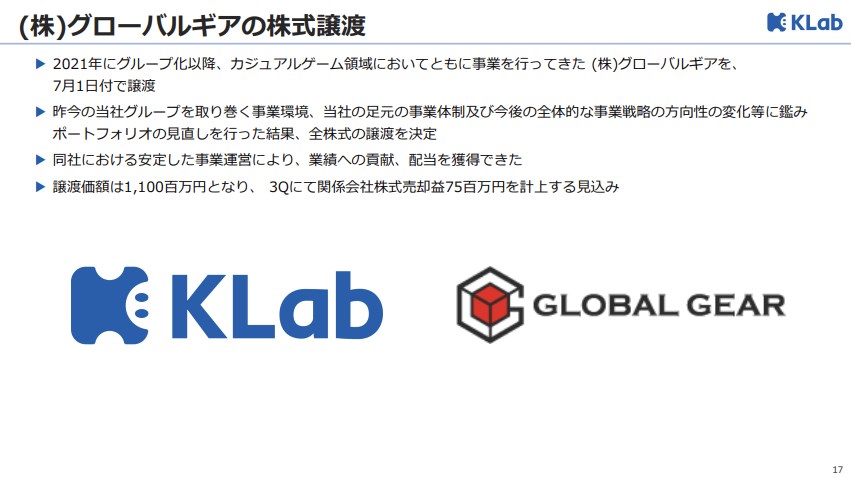 KLabの決算説明資料より…グローバルギアの売却で3Q期間(7~9月)に関係会社株式売却益7500万円を計上する見込みに
