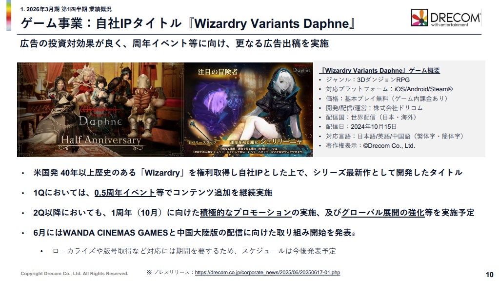 ドリコムの決算説明資料より…1Q(4~6月)の『ウィズダフネ』は売上高23億円と好調を持続 2Q以降も10月の1周年に向けた積極的なプロモーションを実施へ