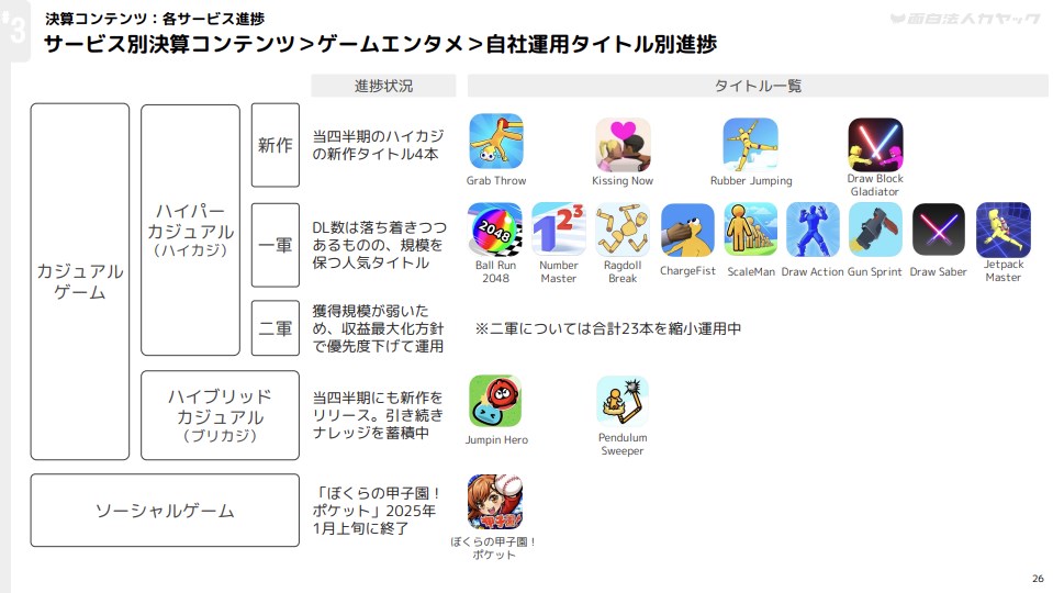 カヤックの決算説明資料より…ハイカジは4Q期間(10~12月)に新作タイトル4本をリリース 『ぼくポケ』終了でソーシャルゲーム運用数はゼロに