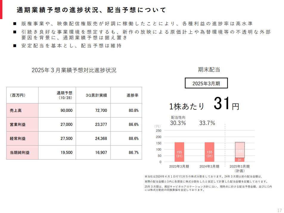 東映アニメの決算説明資料より…3Q累計で売上高・利益とも進捗率80%超に 引き続き良好な事業環境が想定されるも不透明な外部要因を背景に通期予想を据え置き